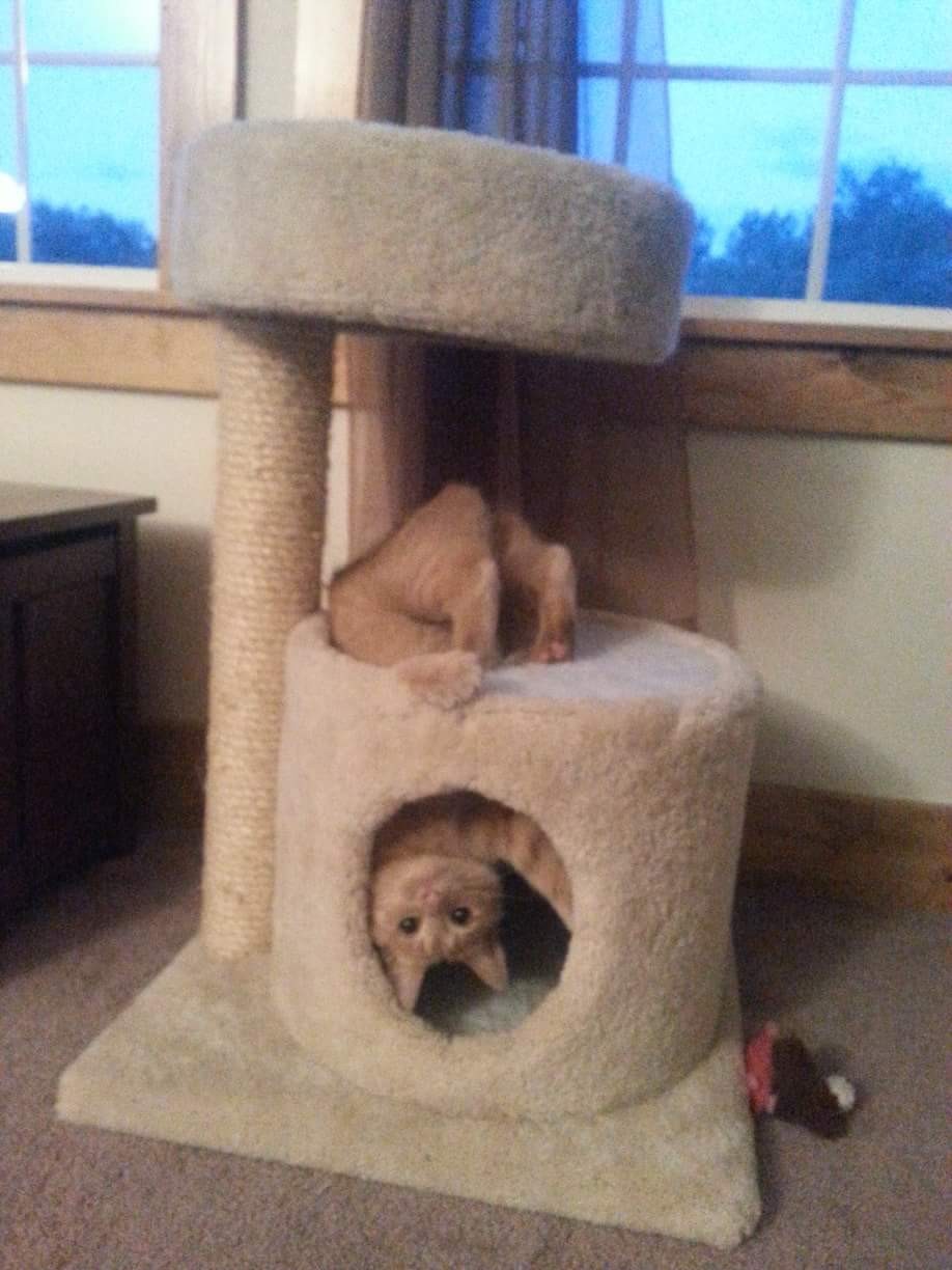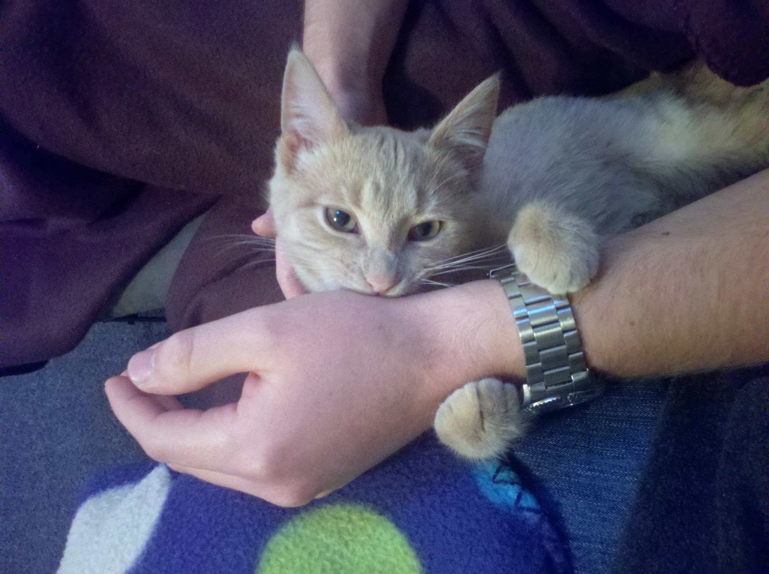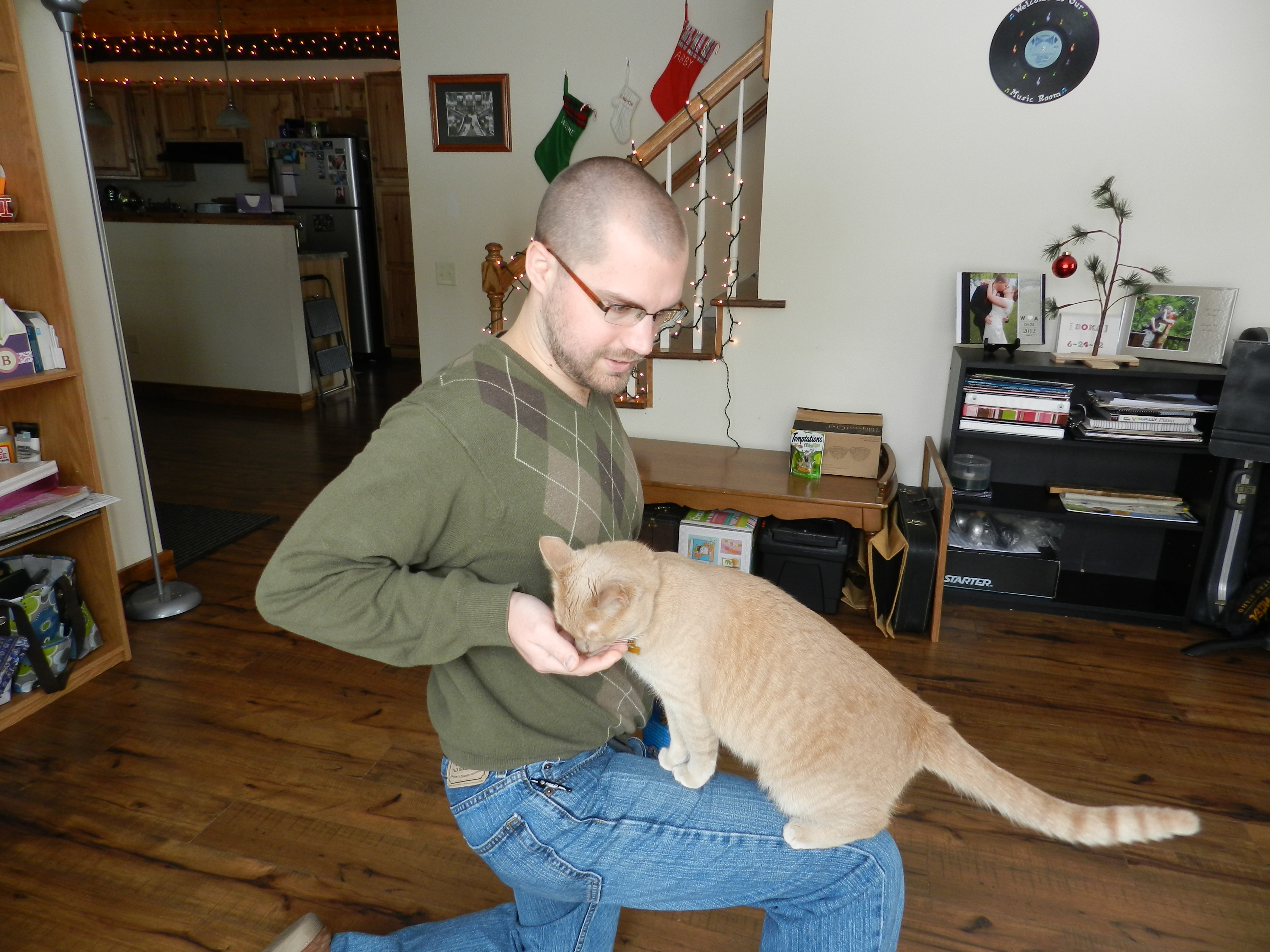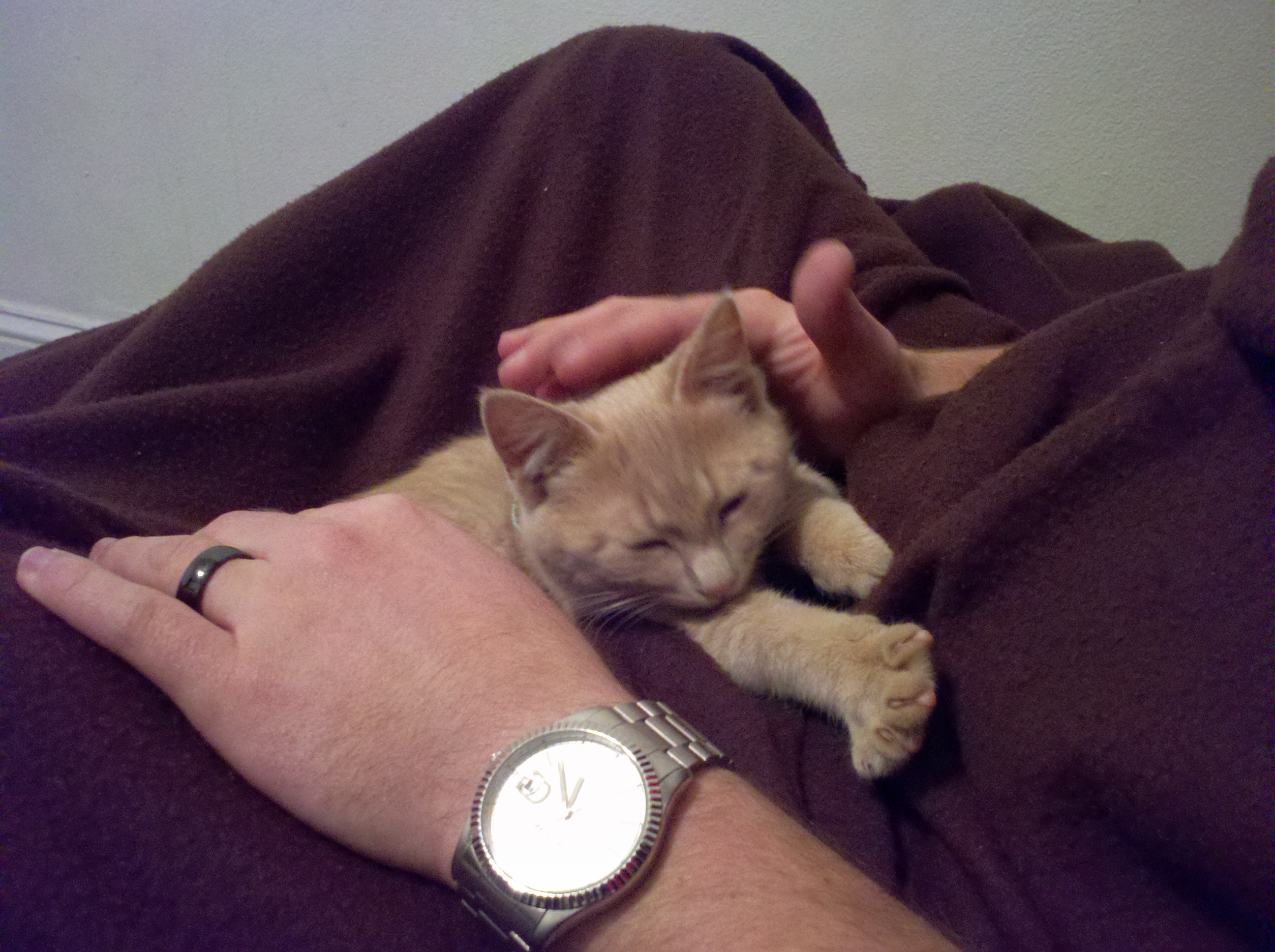 We first met Cinnamon when Abby and I were heading back from her parent’s house the day after Thanksgiving. We had seen a sign on the way saying “Free Kittens Available” and agreed that if they were still available when we got back we would stop in and adopt. We fell in love with Cinnamon (Nala) right away. They didn’t have any pet carriers so we wrapped her up in a green towel for the ride home.